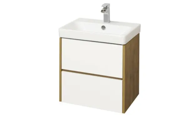 Следующая модель, о которой нельзя не упомянуть – Orange Рио Ri-50TU+RA. Напольная тумба с раковиной подходит для ванной комнаты. Она оснащена доводчиками, что обеспечивает плавное и бесшумное закрытие дверей. Фасад выполнен из МДФ, а корпус – из ЛДСП. Раковина изготовлена из фаянса, а фурнитура имеет хромированный оттенок. В комплект входят ножки и внутренняя полочка, но декоративное кольцо для перелива отсутствует.