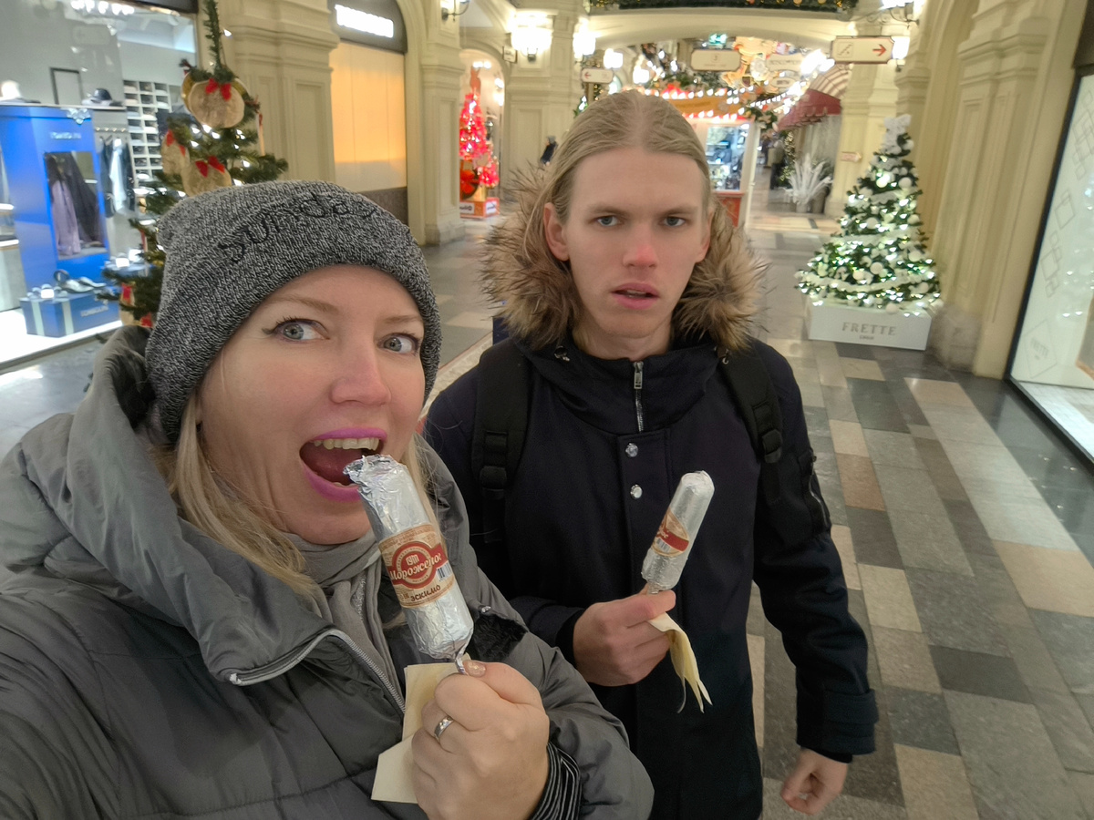 Приветствую вас на моем канале о моей жизни в Севастополе!! Напоминаю, что веду в Телеграме свой канал, где пишу посты в реальном времени. На Дзен захожу редко... Начала нашей поездки тут: В день приезда мы поехали на Красную Площадь, но первым делом зашли в ГУМ и съели там знаменитое советское мороженое Потом долго гуляли по красивому магазину На 1 этаже стоят разнообразные елочки. Я поняла, что каждый магазин поставил свою Советский Новый год А это уже - дореволюционная Россия Поднялись на 3 этаж. Тут туалет недорогой)))) Внизу- Ярмарка елочных игрушек. Выбор огромный, но цены....... Не вижу никакого смысла покупать елочные игрушки по 2-3-5-8 тысяч))) Посмотреть на всю эту красоту....и пойти дальше Листайте: Есть попроще игрушки, но тоже недешевые: Щелкунчики , размером с человека Я очень хочу себе подобного Щелкунчика , но поменьше... Пошли дальше елочки рассматривать Вышли на Красную Площадь. Мы, конечно, хотели увидеть в Москве снег))) Но увидели типичную крымскую зиму в Мос