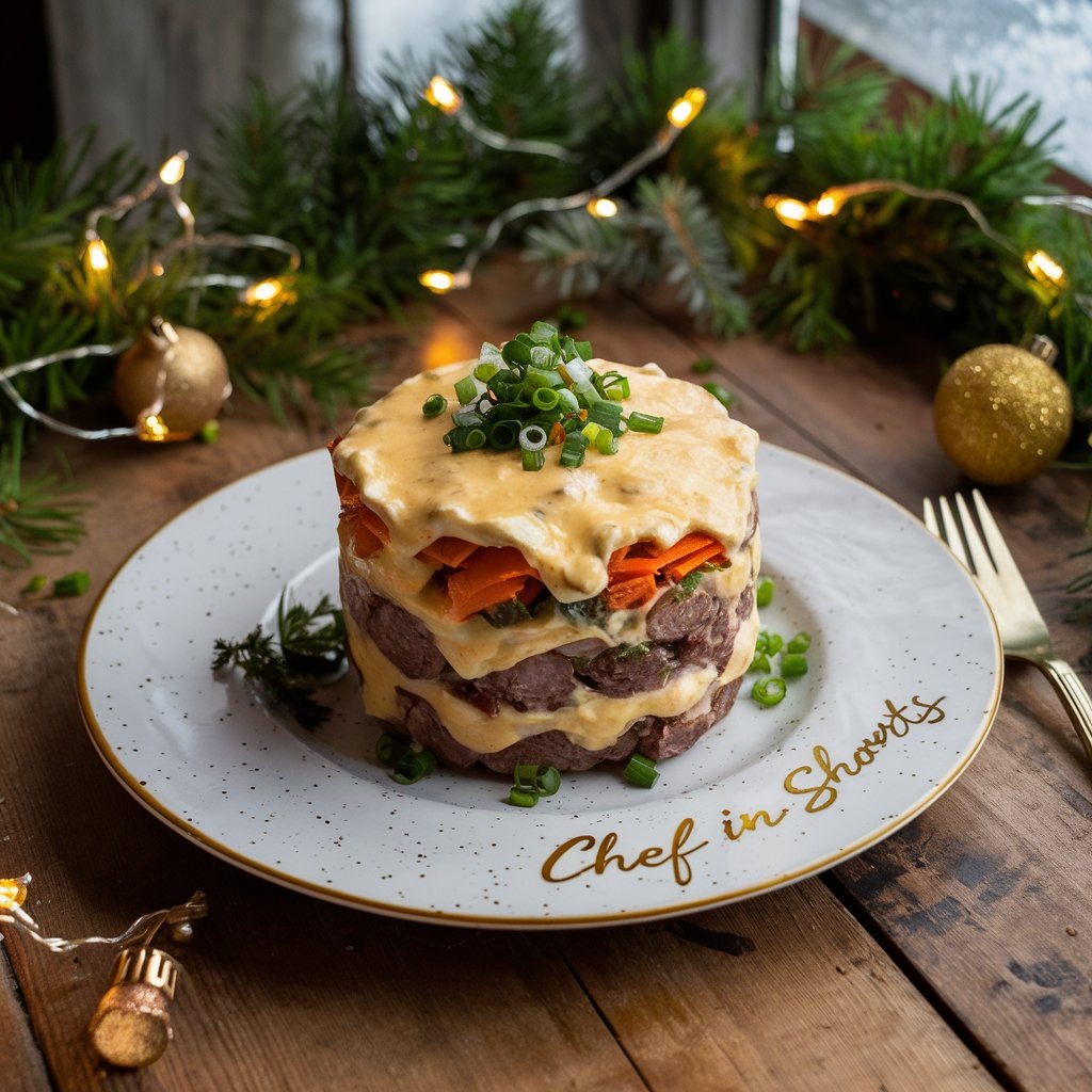 🌟 Описание: Этот салат будто бы парит над столом своей лёгкостью и копчёной глубиной. Каждый слой таит сюрприз: хрустящие овощи, нежный сыр и пикантная колбаса.