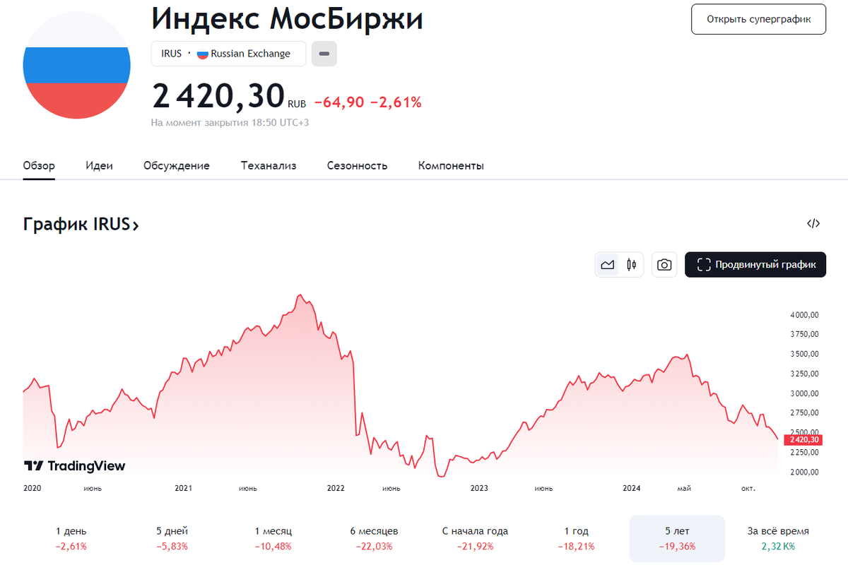 На графике индекса МосБиржи видна устойчивая тенденция к снижению с начала 2022 года. Падение составило -21,92% с начала 2024 года и -19,36% за последние 5 лет. Многие инвесторы задаются вопросами: Давайте разберемся, что происходит с фондовым рынком и можно ли найти свет в конце туннеля. Снижение интереса инвесторов