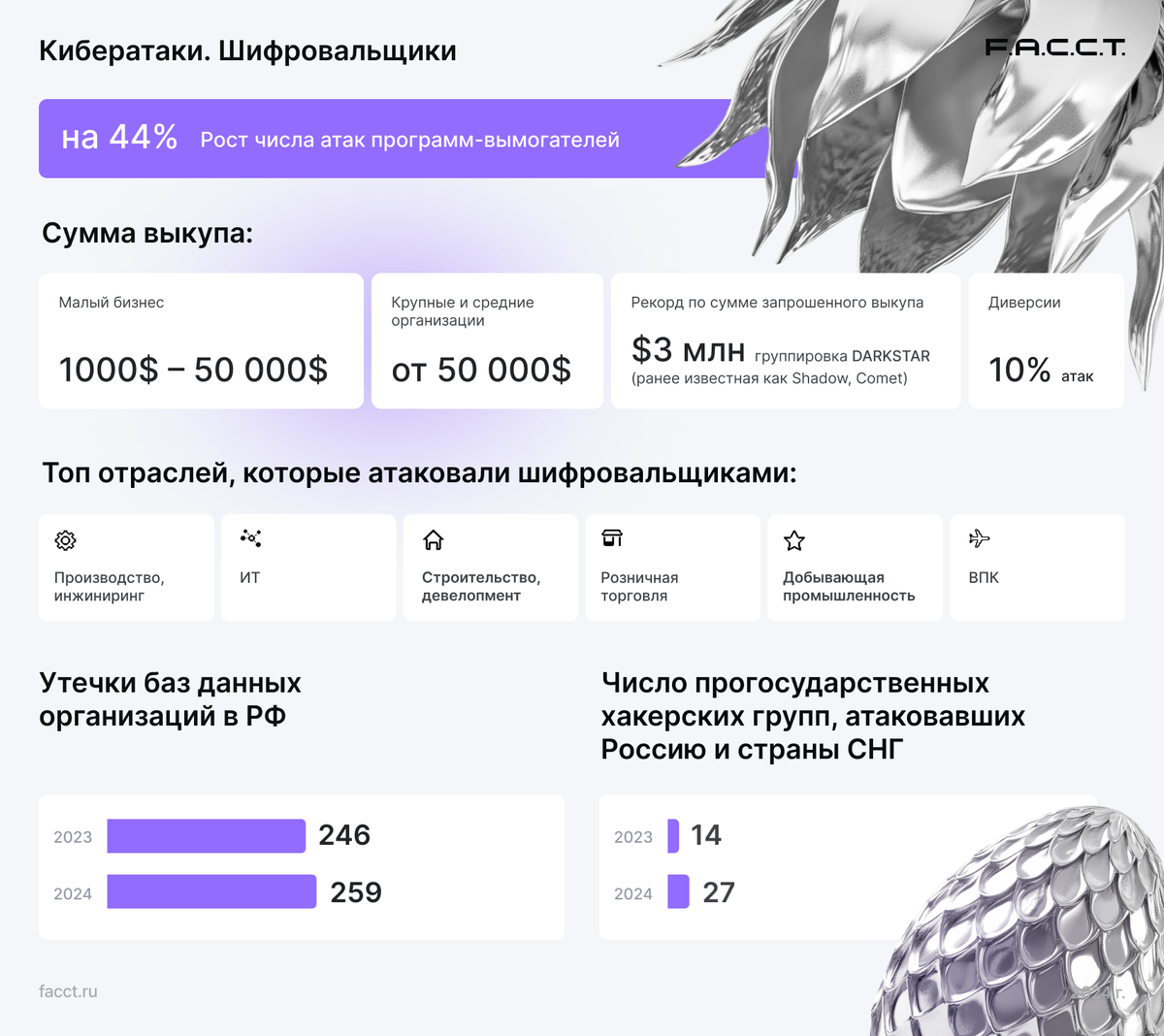 В 2024 году киберпреступления продолжили оказывать значительное влияние на бизнес и общество. По данным компании F.A.C.C.T., российского разработчика технологий для противодействия кибератакам, основными угрозами года стали утечки баз данных, атаки программ-вымогателей и фишинг. Эксперты фиксируют рост всех ключевых киберугроз, который вызывает необходимость пересмотра подходов к киберзащите. Согласно аналитике компании, количество утечек информации российских организаций в 2024 году превысило показатели предыдущего года. В тематических Telegram-каналах и на подпольных форумах было обнаружено 259 ранее не опубликованных баз данных, что на 13 больше, чем в 2023 году. Наибольшие риски в этом году испытывали компании из сферы ритейла, медицинские организации и образовательные учреждения. Большинство утечек выкладывались в публичный доступ бесплатно, что усугубляло последствия для пострадавших организаций. Самым масштабным инцидентом стал слив архива из 404 баз данных. Атаки программ-вымо