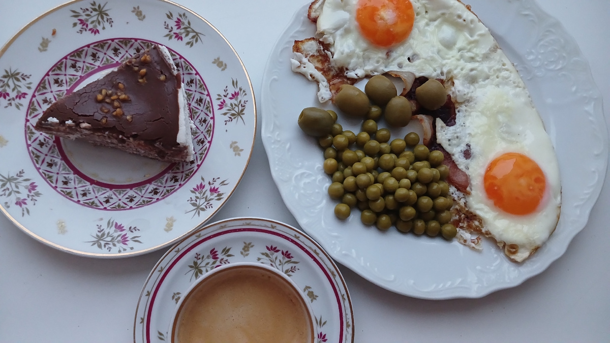 К завтраку сегодня у нас яичница с беконом и зеленым горошком. А к кофе - кусочек блинного торта (Вкусвилл) Потом я уезжала к косметологу в центр Гельтек и в Галерею Ильи Глазунова, гуляла по Арбату. С собой брала батончики мюсли на перекус. Приехала - время уже послеобеденное. Поэтому сначала попила кофе, а потом стала готовить ужин. Перекусила творожком, а кофе у меня с камамбером и конфеткой На ужин пекла печеночные оладьи, сварила макароны на гарнир, и салат из свежей тертой моркови с чесноком и майонезом На ужин приготовила сразу много всего, так что и на завтра тоже еда будет. Меню год назад