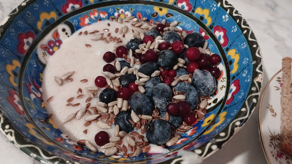 Завтрак многосоставной сегодня: манка из полбы, в тарелку добавила семена подсолнечника и льна, голубику и бруснику творожок, бутерброды с сыром и чашка кофе На обед доела последнюю порцию борща. Муж с утра отогнал машину на замену масла и уехал к другу в гости на целый день. После обеда на десерт мандарины, творожок, сыр и кофе На ужин приготовила плов из булгура с мидиями и овощной салат с айсбергом и медово-горчичной заправкой Рецепт плова с мидиями мы привезли из пансионата "Нева" в Алуште, там был на шведском столе такой плов. Можно и со смесью морепродуктов готовить, и с кальмарами. Меню год назад