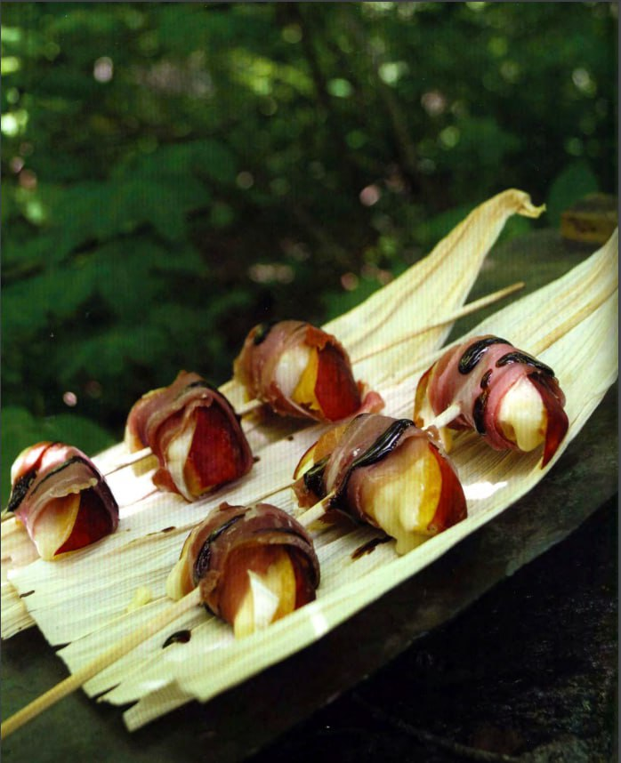 - Для сборки закусок нарежьте кусочек сыра (чуть больше чайной ложки) и намажьте или положите его на ломтик персика. Оберните кусок прошутто или ветчины вокруг сыра и персика, затем насадите на шпажку.