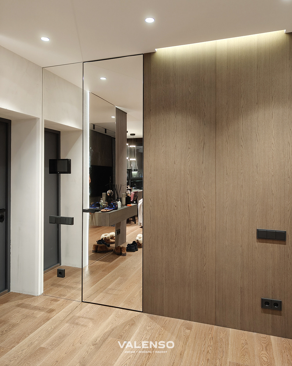 Эта дверь, ведущая в гардеробную, располагается сразу у входа в квартиру. Мы стремились сделать её максимально незаметной, чтобы не нарушать цельность пространства прихожей. Благодаря зеркальной отделке полотна, оно сливается с отражающей поверхностью стены. Визуально перед нами не дверь, а большая зеркальная плоскость, в которой интерьер словно продолжает себя, создавая эффект глубины. Также такое решение выполняет практическую функцию: перед выходом из дома можно быстро оценить свой внешний вид, не перемещаясь по квартире. Само дверное полотно также выполнено в высоту до потолка, без традиционной коробки и наличников, поэтому его трудно заметить на фоне ровных линий. Интересно решено пространство вокруг: с одной стороны от двери стена отделана зеркалом, визуально расширяя прихожую, а с другой – шпоном, который гармонично сочетается с остальной отделкой. В итоге достигается гармония, где дверное полотно практически невидимо, а интерьер остаётся целостным. Важным элементом стала фурнит
