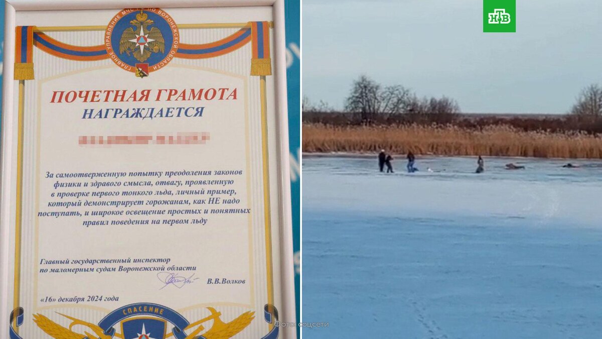 [ Смотреть видео на сайте НТВ ] Житель Воронежа, который провалился под лед и снял это на видео, получил от МЧС грамоту за «самоотверженную попытку преодоления законов физики и здравого смысла». Как сообщила пресс-служба управления МЧС России по Воронежской области, мужчину наградил главный госинспектор по маломерным судам региона Владимир Волков. В тексте грамоты отмечено, что местный житель награждается «за самоотверженную попытку преодоления законов физики и здравого смысла, отвагу, проявленную в проверке первого тонкого льда». Он также подал личный пример горожанам, демонстрирующий, как не надо поступать. По информации местных СМИ, речь идет о фотографе из Воронежа Владимире Малдере. Он вел прямой эфир в соцсетях, катаясь на коньках по тонкому льду в районе поселка Рыбачий. В какой-то момент лед под ним треснул, и мужчина ушел под воду. На помощь ему пришли его друг и очевидцы. Малдер рассказал, что проверять прочность льда с приходом морозов является его традицией, которой он прид