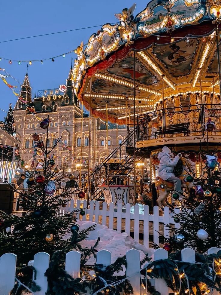 Обязательно прогуляйтесь по вечерней Красной площади — именно тогда праздничные огни и декорации выглядят особенно эффектно. Фотозонами могут стать: Светящиеся арки, ледяные фигуры, укромные уголки в переулках вокруг площади.