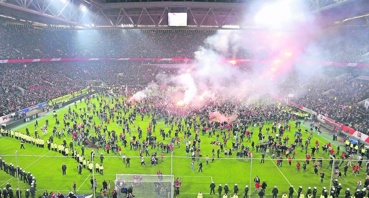 Игру пришлось остановить, а игроки и арбитры были вынуждены покинуть поле ради собственной безопасности. Через 20 минут, после наведения порядка и разгона фанатов, матч был возобновлен и доигран. Однако едва прозвучал финальный свисток, как болельщики снова хлынули на газон, празднуя теперь уже реальное возвращение своей команды в Бундеслигу. Стадион окутали дымовые шашки и фейерверки, в воздухе царила смесь ликования и неуправляемого хаоса.