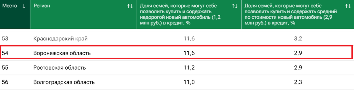 Это если покупать ее придется прямо сейчас по актуальным ценам В опубликованном рейтинге регионов России по доступности автомобилей для населения Воронежская область заняла совсем не почетное 54 место. Согласно выводам экспертов, дешевое авто (до 1,2 млн) себе могут позволить 11,6% воронежских семей, а автомобиль в среднем ценовом сегменте (2,9 млн рублей) в состоянии приобрести и обслуживать лишь 2,9% семей, проживающих в регионе. В своих расчетах аналитики учитывали обслуживание кредита на 3 года с первоначальным взносом в 20%, расходы на ОСАГО, бензин и техобслуживание, сезонную смену резины, налоги и даже плату за парковки. На все эти нужды исследователи попробовали отвести половину семейного дохода за вычетом прожиточного минимума. Выяснилось, что лишь у небольшой доли наших земляков хватит приобрести автомобиль по нынешним ценам. Счастливчики те, кто успели приобрести его раньше. Отметим, что проще всего купить машину будет жителям севера – Ямал, Магадан, Чукотка. На этих террито