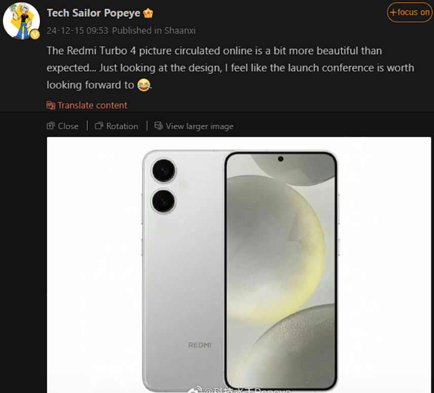 Утечка исходит от китайского сайта микроблогов Weibo, раскрывающего потенциальный дизайн будущего Redmi Turbo 4, который, как упоминалось ранее, вероятно, будет выпущен на международном уровне как Poco F7. На просочившемся изображении показана вертикально расположенный модуль задних камер, включающий два объектива. Спереди можно видеть плоский дисплей с небольшими рамками и вырезом под одиночную фронтальную камеру, как у предшественника.
