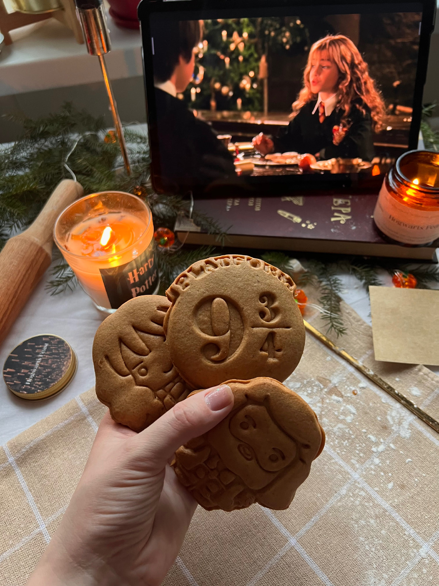 По традиции в предновогодний период хочется добавить чуточку волшебства✨ И какое же волшебство без любимой вселенной Гарри Поттера! На маркетплейсе я заказала формочки для печенья, с помощью которых можно испечь вот такие аккуратные и красивые имбирные печеньки🤎 И, конечно, не могу оставить вас без рецепта имбирного печенья! Ингредиенты (12-15 шт): 🧈сливочное масло 100 гр; 🍯мед 4 ст л; 🍭сахар 100 гр; 🥚яйцо 1 шт; 🌾мука 280-300 гр; 🫚сушеный имбирь 1 ч л; 🌰мускатный орех 1 ч л; 🤎корица 1 ч л; 🤌🏽сода 1/2 ч л; 🤌🏽щепотка соли В сотейник добавьте сахар, мед и сливочное масло, отправляем на плиту до полного растворения сахара и однородной массы; Добавляем в сотейник специи, перемешиваем и даем смеси чуть остыть; Разбиваем в смесь одно яйцо, перемешиваем венчиком; Добавляем постепенно порциями муку с содой и солью, замешиваем тесто руками. По консистенции оно должно быть пластичным и не липким. Если липнет к рукам - добавьте муки; Сформируйте комок теста и отправьте в холодильник