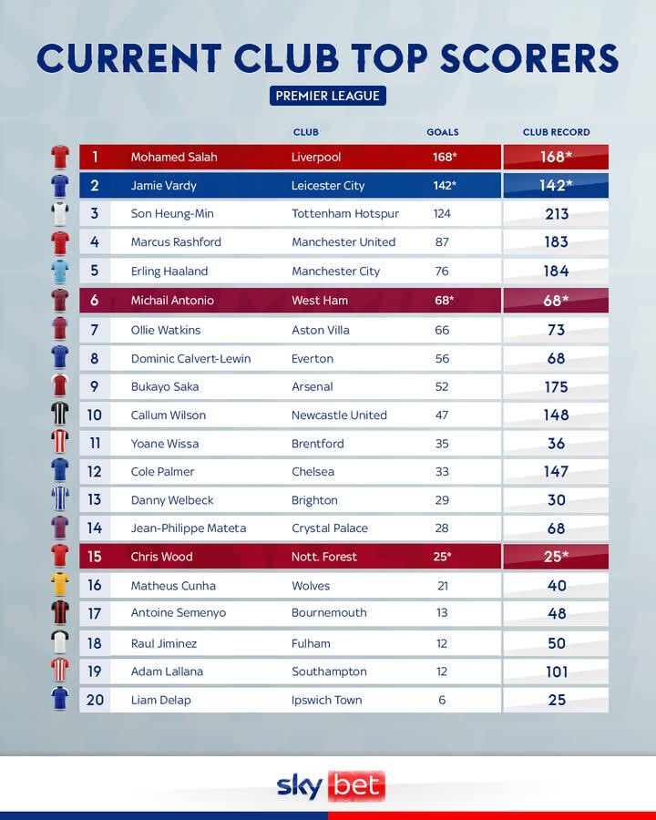 Sky сравнил показатели лучшего бомбардира каждой команды нынешнего розыгрыша АПЛ с клубными рекордами. Лишь четыре лучших бомбардира в истории клубов в АПЛ до сих пор выступают за свои команды. Речь о Мо Салахе («Ливерпуль»), Джейми Варди («Лестер»), Микаиле Антонио («Вест Хэм») и Крисе Вуде («Ноттингем Форрест). Внушительнее всего выглядят результаты «Тоттенхэма», Харри Кейн, лучший бомбардир в истории клуба, забил за «шпор» 213 голов в Премьер-лиге. На счету Сон Хын Мина, лучшего бомбардира в нынешнем составе команды, 124 мяча за «Тоттенхэм» в английском первенстве. Лучшие бомбардиры в нынешних составах команд АПЛ Имя игрока, клуб, количество голов за клуб в АПЛ, рекорд клуба по голам в АПЛ В рейтинге есть неожиданности? Лучшие бомбардиры АПЛ по сезонам. Вспоминаем всех с 2007 года по наши дни Лучшие игроки команды сейчас VS легенды клуба. Сравниваем статистику звезд большой шестерки АПЛ Самый высокооплачиваемый игрок в истории АПЛ суммарно заработал 196 млн евро! Стерлинг второй, в