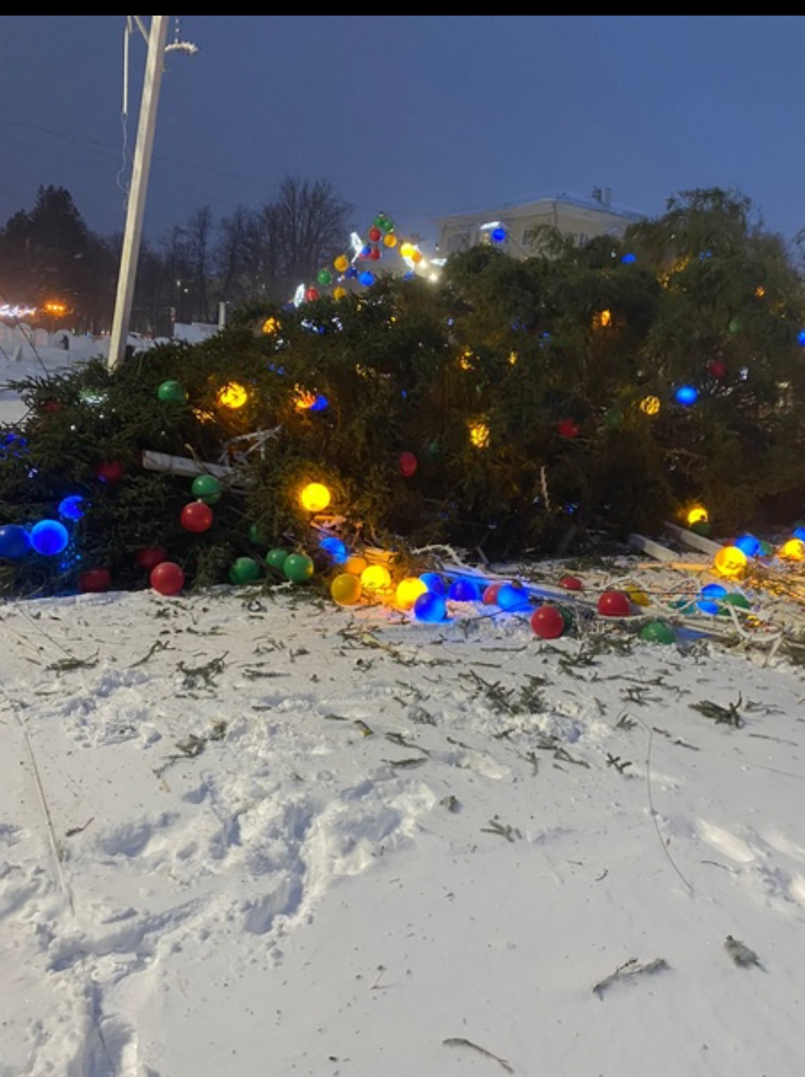 Доброе утро!!! Сегодня всю ночь у нас бушевал шквалистый ветер. Мело так, что ничего не было видно. Рамы оконные гудели всю ночь. Я боялась, что их вырвет. На площади им. С. Орджоникидзе у нас ежегодно ставят и наряжают красивую ель и ледовый городок. В этом году ель также была установлена и наряжена. Но вчерашний ветер снёс и повалил ёлку. Так она лежала и светилась. Хорошо, что в тот момент рядом никого не было. Смотрите, как повезло припаркованной машине на следующем фото: Коммунальные службы работали всю ночь, при плохих погодных условиях ставили ёлку на место. Очевидцы говорят, что её ветром валило несколько раз при установке. Но всё закончилось хорошо! Ёлка стоит на своём месте. Осталось только её нарядить и зажечь огни. К Новому году и снега намело. В садовой группе пишут, что от ветра снесло весь лёд на реке, и река опять пошла. Сейчас ветер стих, метель прекратилась. За окном прекрасное зимнее утро! Я с котами желаю Вам всем хорошего дня, отличного настроения! Спасибо, ч