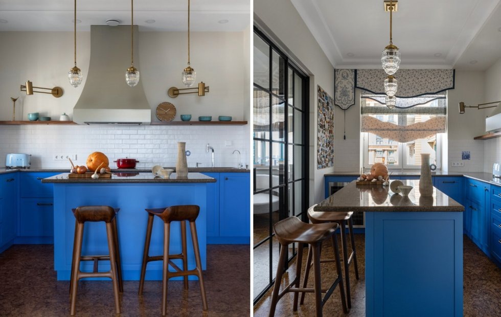 В проекте много уникальных предметов. Плитка азулежу в голубом санузле привезена из Португалии. Светильники антикварные из разных стран мира, часть была сделана на заказ в единственном экземпляре.