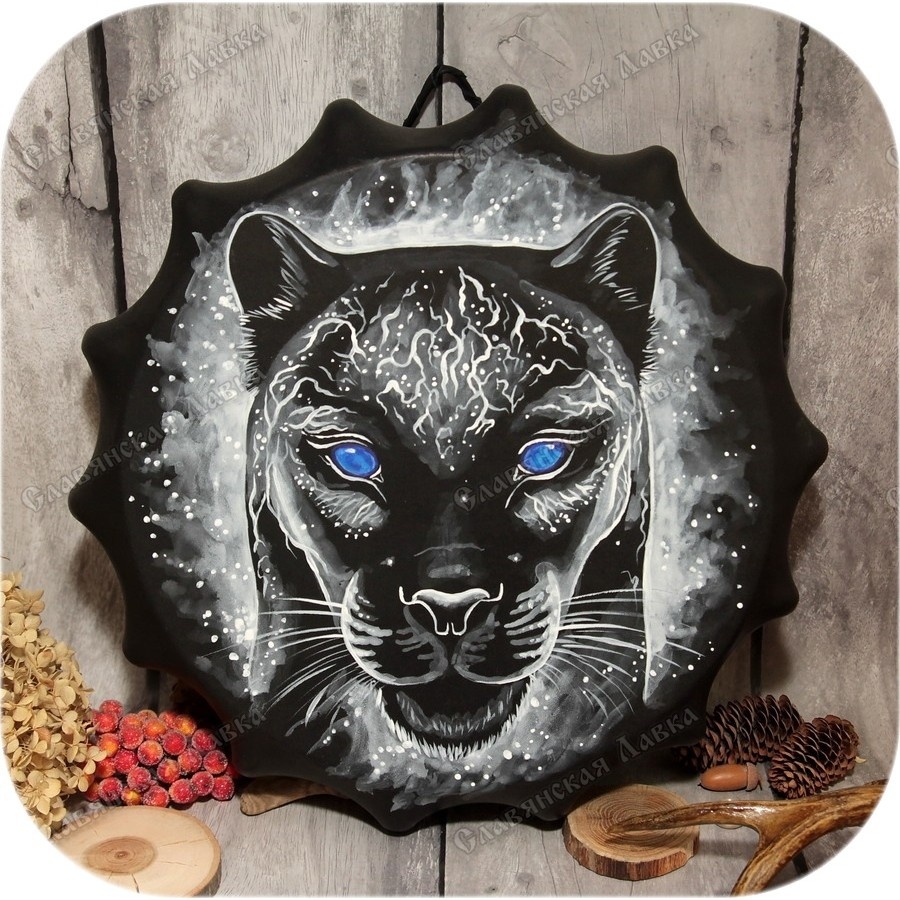 Шаманский бубен "Душа пантеры" Благодарность мастеру: 10990 - Заявки можно скидывать на WhatsApp по номеру телефона 8-913-367-4141 Шаманский этнический бубен, выполненный в уникальном стиле. На бубне размещены 14 резонаторов. Звук бубна звонкий и продолжительный. Это отличный бубен для практик, медитаций и обрядов. Оформлен бубен отличным рисунком от нашей талантливой художницы Алёнушки. Композиция и исполнение - полностью авторские и не привязаны к конкретной культуре, с одной стороны, но не забыты все важные атрибуты - с другой. Общий концептуальный смысл можно понимать по-разному, но в основе лежит тотемизм. Пантера здесь является и непосредственно тотемом, и, в определённой степени, защитным оберегом. Дело в том, что у некоторых народов именно пантера являлась спутником шамана, более того, считалось, что она защищает шамана при его странствиях. Логично, что пантера в наших краях - зврь редкий, но чувства духовного родства с этим грациозным животным уже достаточно для того, чтобы из