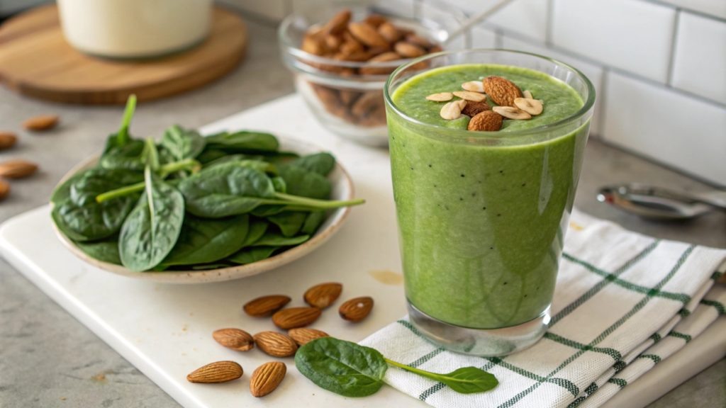 Шпинатный смузи с авокадо и миндалем — это прекрасный способ добавить в свой рацион зеленые овощи и полезные жиры. Смузи имеет нежную текстуру и освежающий вкус, что делает его отличным вариантом для завтрака или перекуса. Это блюдо популярно среди любителей здорового питания и является отличным источником витаминов и минералов. Тщательно промойте шпинат под холодной водой. Очистите банан и авокадо, нарежьте их на кусочки. Если вы используете цельный миндаль, положите его в блендер и измельчите до состояния мелкой крошки. В чашу блендера добавьте шпинат, кусочки авокадо, банан, измельченный миндаль и молоко. Если хотите, добавьте мед для сладости. Закройте крышку блендера и взбивайте на высокой скорости до получения однородной массы. При необходимости добавьте немного воды, чтобы добиться нужной консистенции. Перелейте смузи в стакан и украсьте сверху небольшим количеством миндаля или зелени шпината. Подайте немедленно! Для более насыщенного вкуса можно добавить немного лимонного сока.