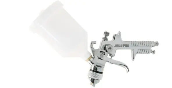 По праву в наш обзор входит Jeta PRO JL827, который оборудован пластиковым резервуаром на 0.6 литра и металлическим корпусом. Устройство подключается посредством 1/4-дюймового воздушного штуцера и использует технологию HVLP для нанесения лакокрасочных материалов. Модель характеризуется верхним вводом материала и резьбовым присоединением.