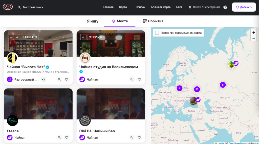 Как вы прекрасно понимаете, ценность таких сервисов определяется их наполняемостью и актуальностью. На момент написания новости на сайте была информация о 121 чайной в России и Беларуси. Честно говоря, я даже не готов сказать, много это или мало. Масштаба сегмента китайских чайных в наших странах я не представляю совсем. Но части известных мне проектов, причем весьма заметных, в системе пока нет.