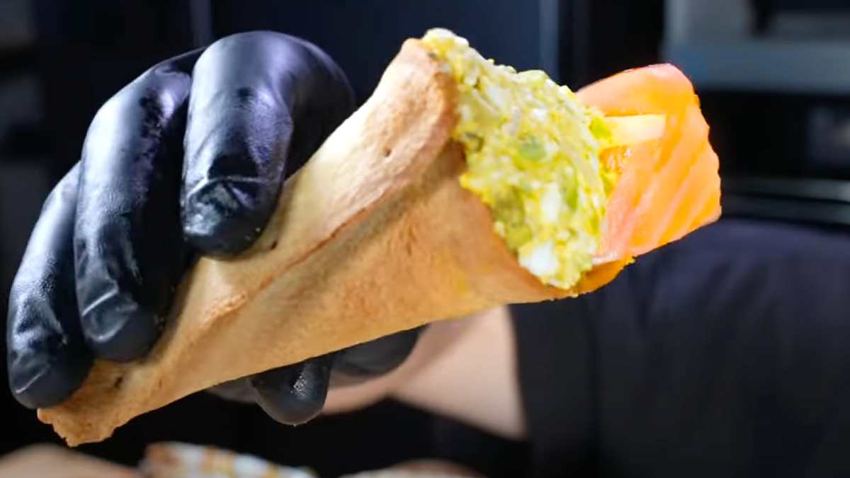 Начнем готовить. Сперва хлеб нужно раскатать с помощью скалки и сделать тонким, хлеб я купил уже нарезанный и очень мягкий. Таким хлебом очень удобно формировать конусы нашего будущего блюда. Теперь сформировать конус Теперь зафиксировать его деревянными зубочистками Теперь выложить на противень И отправить в духовку 180 градусов пока не станут румяными и хрустящими. Так это конусы или рожки? Как лучше называть такую форму? Пока конусы приобретают цвет поставим варить яйца. Яйца варить до полной готовности минут 10 Теперь яйца отравляем в холодную воду, у меня вода со льдом. Очищаем яйца, после холодной воды они чистятся очень легко и просто. Теперь отправляем яйца в посуду и измельчаем с помощью толкушки, или картофелемялка. А как вы называете донное приспособление? Теперь очищаем авокадо, авокадо лучше купить мягкое, так как консистенция салата должна быть нежной. Теперь нарезаем маленькими кусочками, у меня авокадо очень спелое и мягкое. Теперь нарезаем белый лук, тоже мелкими ку