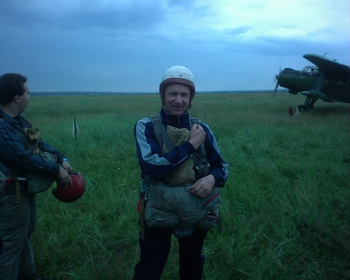 АН-2 стоит на земле, а мы прыгаем на землю и под счет 121.122,123 дергаем кольцо. Наконец грузим парашюты в автобус и едем на летное поле. Погода жаркая, но на востоке, на горизонте видны вспышки грозы. Получаем парашюты, подгоняем ремни. Мне достается белая каска. Ни у кого такой нет!