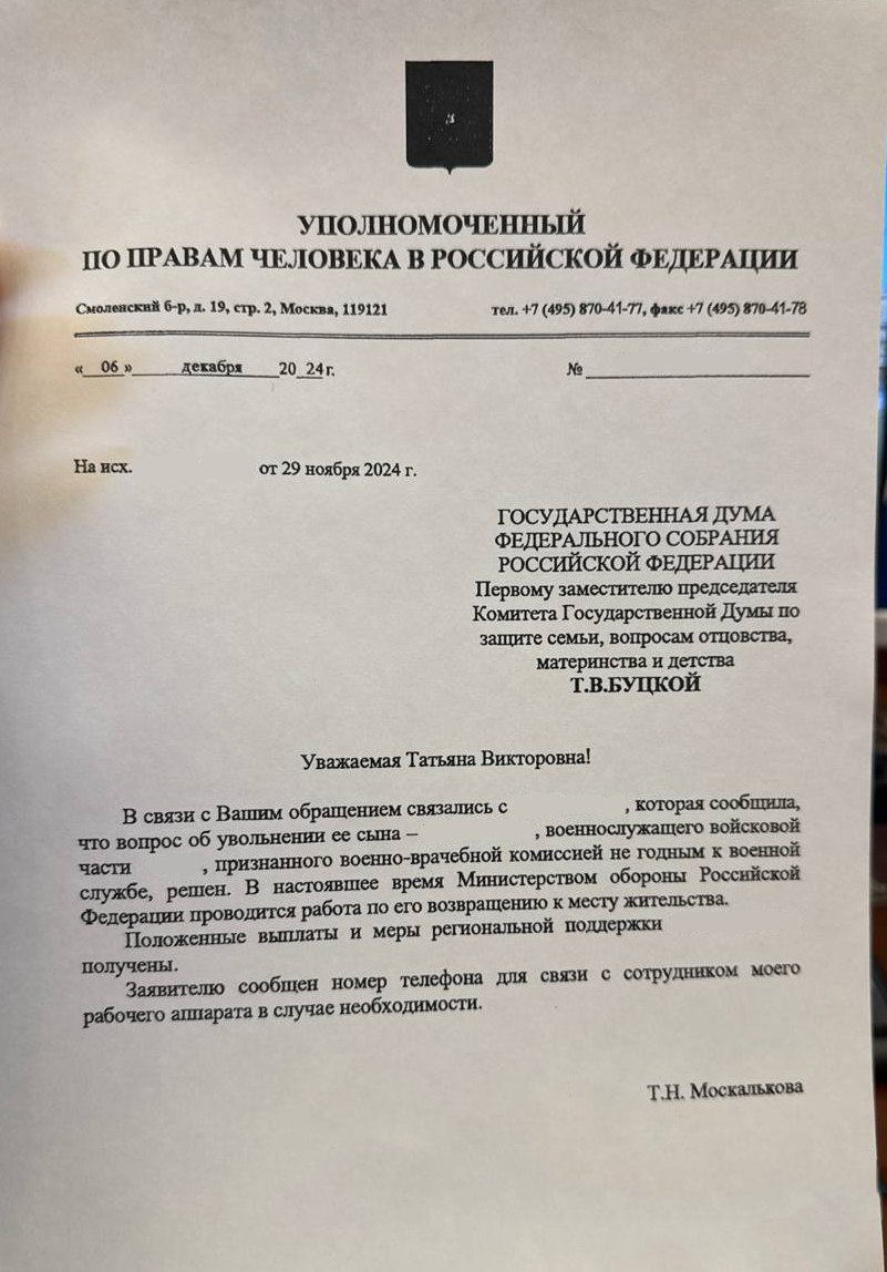 Недавно ко мне обратилась мама военнослужащего, который получил боевое ранение в ходе выполнения задания в рамках специальной военной операции. Сейчас военнослужащий может передвигаться только на инвалидной коляске. Его мама просила помочь вернуть сына домой для положенного отпуска на лечение. С соответствующей просьбой я обратилась к уполномоченному по правам человека в России Татьяне Москальковой. 6 декабря пришел официальный ответ, из которого следует, что Министерство обороны РФ проводит работу по возвращению военнослужащего домой! Большое спасибо Татьяне Москальковой и Министерству обороны РФ за оперативную помощь в решении вопроса!