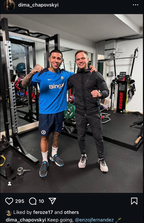 Фанаты «Челси» нашли фото Энцо Фернандеса и персонального тренера Михаила Мудрика, который сдал положительный допинг-тест. Вингеру теперь грозит дисквалификация.