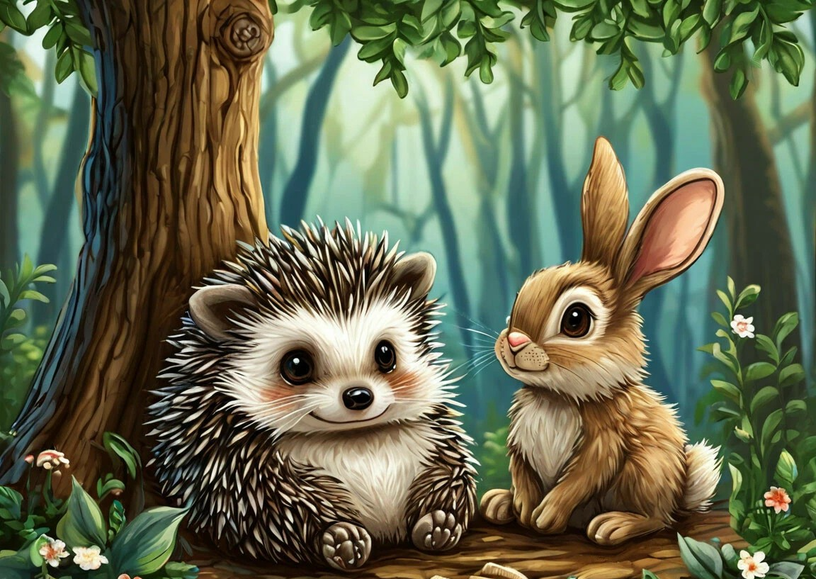 🟠 Как-то раз, летним днём к Колючке прибежал в гости его единственный друг, весёлый Зайчонок. Колючка был ежиком-интровертом. Он любил тишину и покой своего уютного гнездышка под старым деревом. Ему нравилось наблюдать за мирно жужжащими пчёлами, слушать шелест листьев и пение птиц. Общение с другими животными, кроме Зайчонка, ему казалось шумным и утомительным. “Привет, Колючка! Давай поиграем в догонялки!” - радостно воскликнул Зайчонок, уже скакавший вокруг дерева. Колючка вздохнул. Он любил Зайчонка, но его энергия была иногда слишком.. бурной. “Сегодня я хочу просто полежать и послушать птиц”, - ответил Колючка. Зайчонок огорчился, но не стал настаивать, а просто помчался дальше. Колючка улыбнулся, как не крути, а ему нравилось, что у Зайчонка всегда было так много энергии. Он был рад, что у него есть такой верный друг, который его понимал. Вдруг раздался шум. Из леса выбежал испуганный Зайчонок, за ним гналась лиса. Колючка, забыв о своей интровертности, моментально бросился н