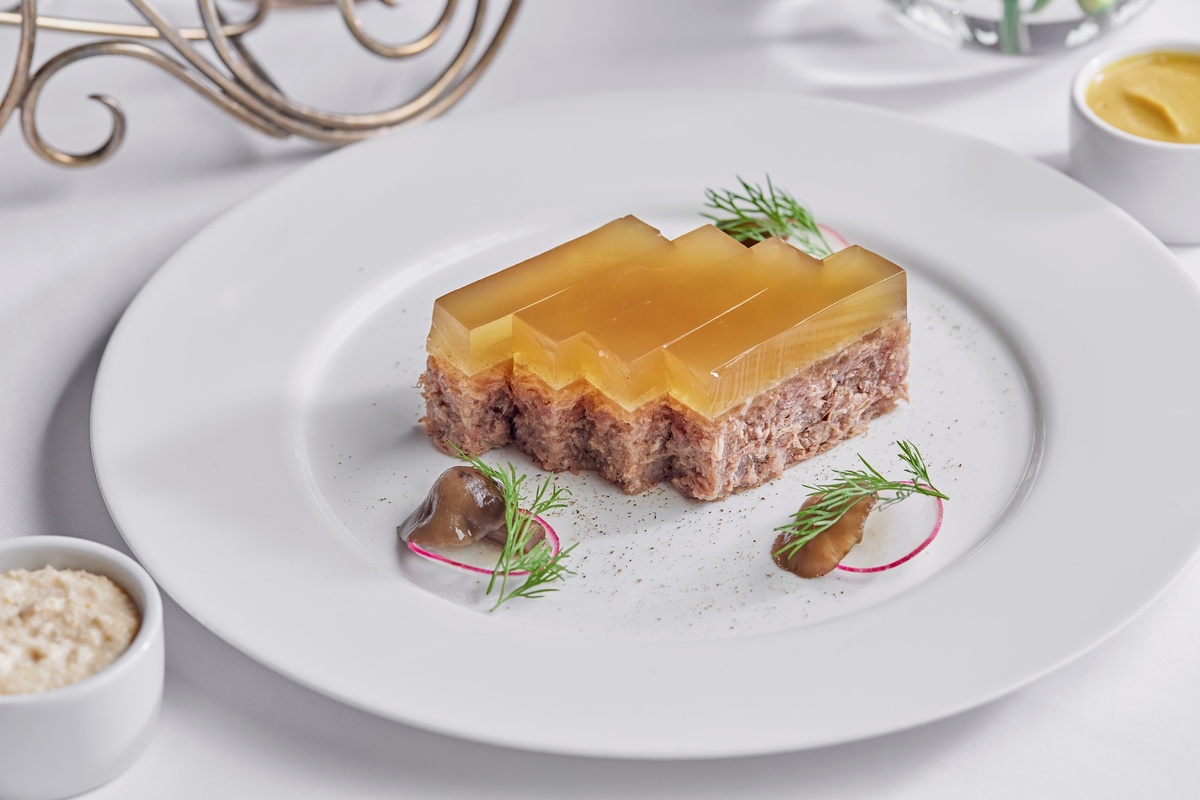 Рецепт от Виталия Россохи, шеф-повара гранд-кафе «Dr. Живаго» Ингредиенты на 6-8 порций: Процесс приготовления: 2. Мытую и очищенную морковь нарезать произвольными крупными частями и вместе с очищенным луком запечь в духовке при температуре 180 градусов примерно 10-12 минут. Овощи добавить в бульон. 3. Бульон посолить, добавить лаврушку, чеснок и перец горошком. Оставить кастрюлю на 5-6 часов на маленьком огне и без крышки. Бульон должен не кипеть, а булькать. 4. Через 5-6 часов шумовкой достать все содержимое. Если сверху бульона много жира, его нужно снять половником. Через сито, нарытое марлей, процедить бульон в чистую и сухую кастрюлю. 5. Сборка холодца. Мясо разобрать на волокна, отделить мякоть от костей. Ппробовать на соль, при необходимости досолить. Выложить на дно дну сухой емкости. Залить первой партией процеженного бульона - так, чтобы он покрывал мясо на 0,5-1 см. Накрыть пленкой, поставить в холодильник на на 2-3 часа. 6. После доставить «полухолодец», на нем сверху обра