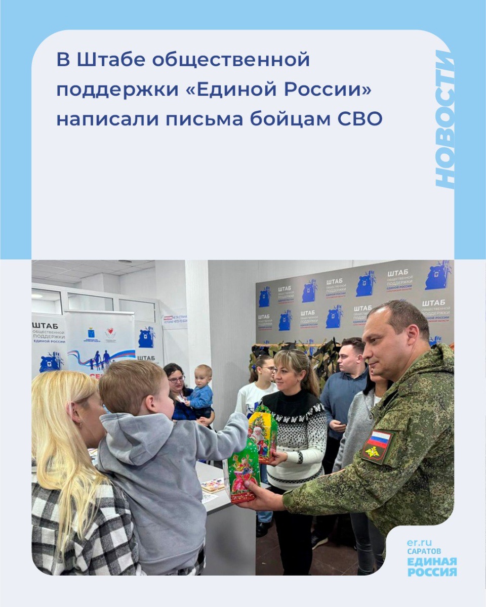 🎖️На площадке Штаба регулярно проходят массовые мероприятия в поддержку участников СВО и членов их семей. На мастер-классах, направленных на поддержку бойцов, в рамках онлайн участия Штаба в XXII съезде партии, ученики из разных школ Саратова школ и детских садов проявили свои таланты и креативность. Ребята написали письма поддержки участникам СВО, в том числе своим близким, которые в настоящее время находятся в зоне проведения специальной военной операции. Рисовали яркие рисунки, выжигали узоры на дереве. В завершение мероприятия ребята получили сладкие новогодние подарки от депутата Саратовской областной Думы Андрея Еремина. 💬«Подобные мероприятие имеют очень большое значение. Они объединяют нас для добра - помощи нашим героям, участникам СВО. И одновременно дарят детям радость созидания, учат полезным навыкам, развивают способности ребят», - отметил Андрей Еремин.