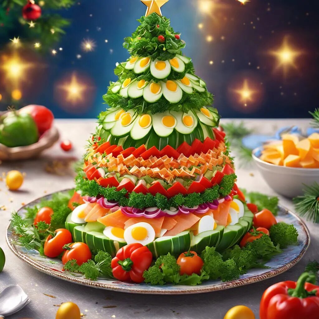 Этот яркий и праздничный салат станет украшением вашего новогоднего стола! ### Салат в виде елки #### Ингредиенты: - 2-3 картофелины - 2 моркови - 3 яйца - 200 г консервированной горошка - 150 г сыра (твердый) - 200 г куриного филе (отварного) - Майонез - Зелень для украшения (укроп, петрушка) - Красный болгарский перец (для украшения) #### Приготовление: 1. **Подготовка ингредиентов**: - Отварите картофель, морковь и яйца до готовности. Остудите и очистите. - Отварите куриное филе, остудите и нарежьте мелкими кубиками. - Натрите картофель, морковь и сыр на крупной терке. 2. **Формирование салата**: - На плоской тарелке выложите слой из натертого картофеля. Смажьте его майонезом. - Сверху положите куриное филе и снова смажьте майонезом. - Далее выложите натертую морковь, снова смажьте майонезом. - Затем выложите слой из горошка и снова майонез. - Завершите салат слоем натертого сыра. 3. **Создание формы елки**: - С помощью ножа или лопатки придайте салату форму елки, делая его более ос