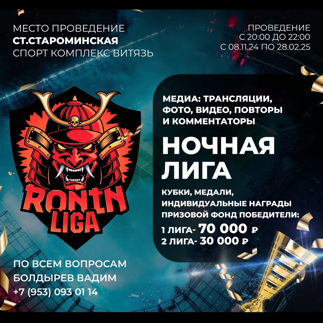 8 ноября стартовал районный чемпионат по мини-футболу «Ronin Liga», который завершится 19 января следующего года, потом будет кубок. Почему лига ночная? Все игры проводятся в вечернее время в спортивном комплексе «Витязь».