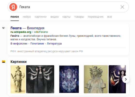 Вики: Гека́та — анатолийская и фракийская богиня Луны, преисподней, всего таинственного, магии и колдовства. Внучка титанов.