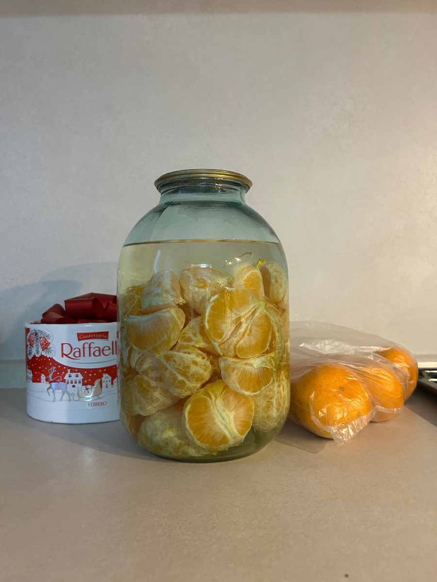 До Нового года 2 недели и мы еще успеваем приготовить новогоднюю настойку. Идем в магазин и покупаем 1,5 кг. мандаринов, 3 бутылки водки( в моем случае Граф Ледофф). Дома в 3 литровую банку накладываем мандарины и заливаем водку, банку закатываем крышкой и отправляем в темное место до 31.12.2024 г.😂 Кто-то так пробовал, делитесь в комментариях. А еще я делаю настойки на рябине, смородине, терне, вишне и сосновых шишках, кому интересно, спрашивайте в комментариях.