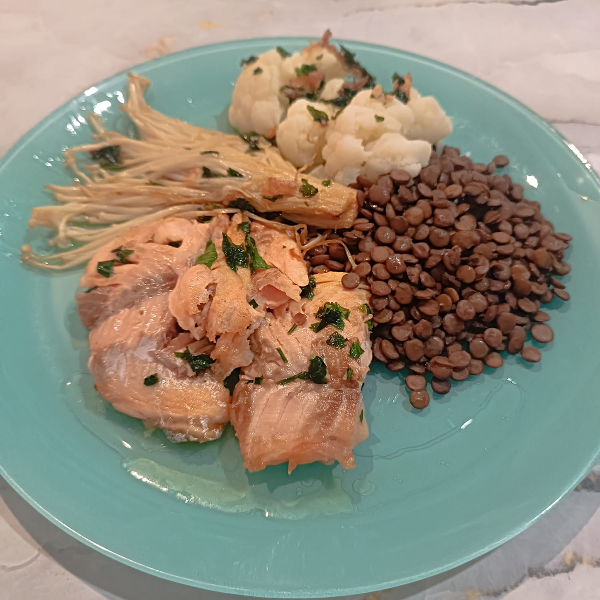 Доброго четверга! Давно присматриваюсь к этому рецепту. Понадобится филе рыбы. Как говорит Лазерсон - любой рыбы. Но мы возьмём красную рыбку, речную радужную форель. У меня была полутушка, с реберными косточками и на коже, вес примерно 0.5 кг. Кости я вытащила и кожу сняла. Филе быстрее и проще готовить и приятнее и удобнее есть ) Далее порежем филе на порционные кусочки и обильно засыплем солью. Я использовала две столовые ложки морской соли. По рецепту был ещё сахар, не использовала. Оставим на 10 минут. По прошествии времени промоем под проточной водой и обсушим бумажными полотенцами или тряпочкой. Разогреем сковороду и растительное масло для жарки на ней тоже разогреем. Я обзавелась вот таким турецким оливковым маслом для жарки. Убавим огонь наполовину и готовим рыбу 1 минуту. У меня электрическая плита, разогрела на "6", далее готовила на "3". Добавим кусочек топлёного сливочного масла , около 1 чайной ложки и пучок порубленной петрушки. Когда масло растает, перевернём рыбу и,