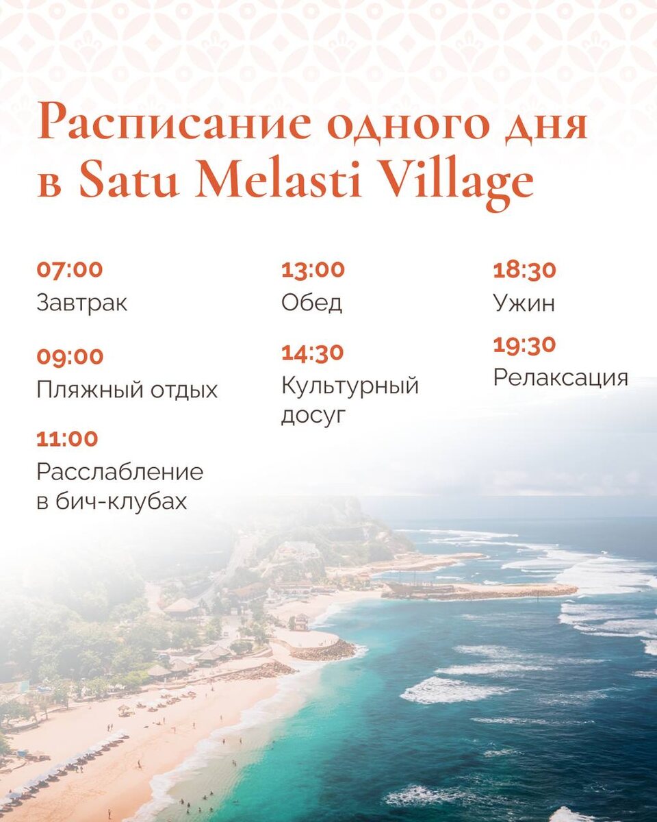 Предлагаем вам маршрут, который включает гастрономические открытия, активный и пляжный отдых, а также знакомство с культурными достопримечательностями, расположенными неподалеку от Satu Melasti Village 07:00–09:00: Завтрак и утренний кофе Начните день с завтрака в одной из местных кофеен. Выбирайте “Oliverra” для свежей выпечки и тёплой атмосферы или “Tropical Temptation”, если хотите насладиться вкусным кофе с красивым видом. 09:00–11:00: Пляжный отдых и активный спорт Отправляйтесь на пляж Меласти для серфинга, снорклинга или прогулки вдоль берега. Для любителей адреналина - «Melasti Cliff Paragliding» (10 минут от пляжа), чтобы испытать эмоции от полета с видом на океан. 11:00–13:00: Расслабление в бич-клубах Расслабьтесь в одном из бич-клубов рядом с пляжем. «Sundays Beach Club» - уютная атмосфера и коктейли, «Palmilla Bali Beach Club» - стильное место с бассейнами и видом на океан, «White Rock Beach Club» - для активных отдыхающих. 13:00–14:30: Обед в топовых ресторанах Выберите