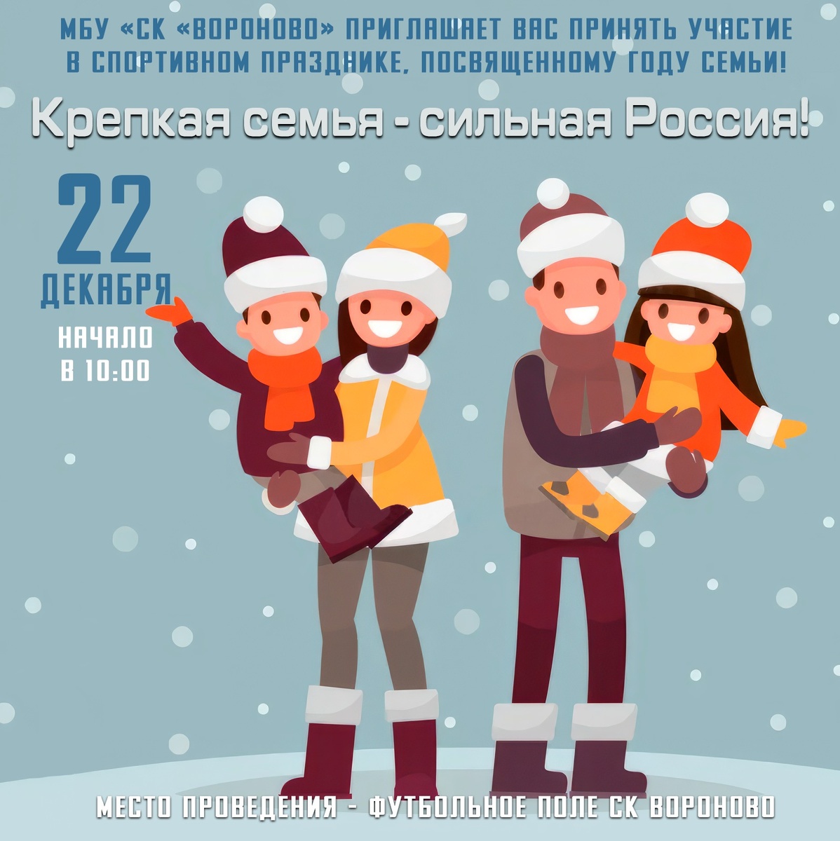 22.12.2024 года в 10:00 на футбольном поле МБУ "СК "Вороново" пройдет спортивное мероприятие посвященное Году семьи "Крепкая семья - сильная Россия"