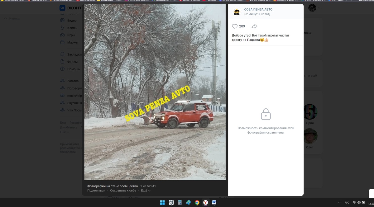 Сегодня, 17 декабря, в городе была замечена «Нива» с необычным апгрейдом. Владелец авто прикрепил на переднюю часть машины отвал для чистки снега.