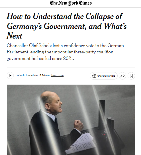 Если кто не в курсе, одной из основных целей введения санкций против нашей страны была именно эта - чтобы недовольные люди вышли на митинги протестов и свергли действующую власть. Но, в очередной раз, всё пошло не по плану. Для начала можем вспомнить Британию с бесконечной чехардой премьер-министров, затем проблемы Макрона во Франции. А теперь вот и Германия подтянулась. Уверяю вас, я нисколько не нагнетаю, пишет Нью-Йорк Таймс: Крах правительства Германии, что будет дальше? Правительство Германии распалось после того, как канцлер Олаф Шольц потерял вотум доверия в парламенте, что усугубило кризис лидерства в Европе в период нарастания экономических проблем и проблем безопасности, включая поставки военной помощи за рубеж. Вчерашнее голосование за роспуск правительства, которое прошло 394 голосами против 207 при 116 воздержавшихся, оставляет крупнейшую экономику Европы в руках временного правительства в преддверии выборов в начале следующего года. У Шольца не было иного выбора, кроме