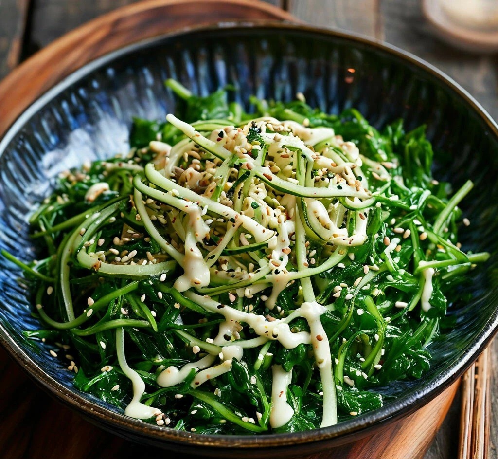 3. В миске смешайте огурцы, водоросли чуку, салат айсберг и добавьте ореховый соус.