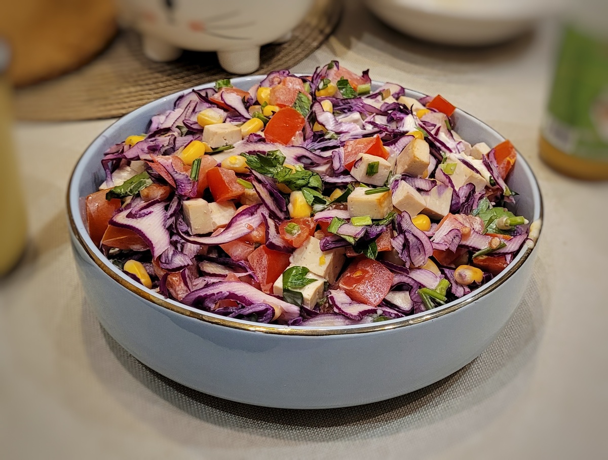 Все просто! Капусту шинкуем, помидоры и тофу режем не крупными кубиком,