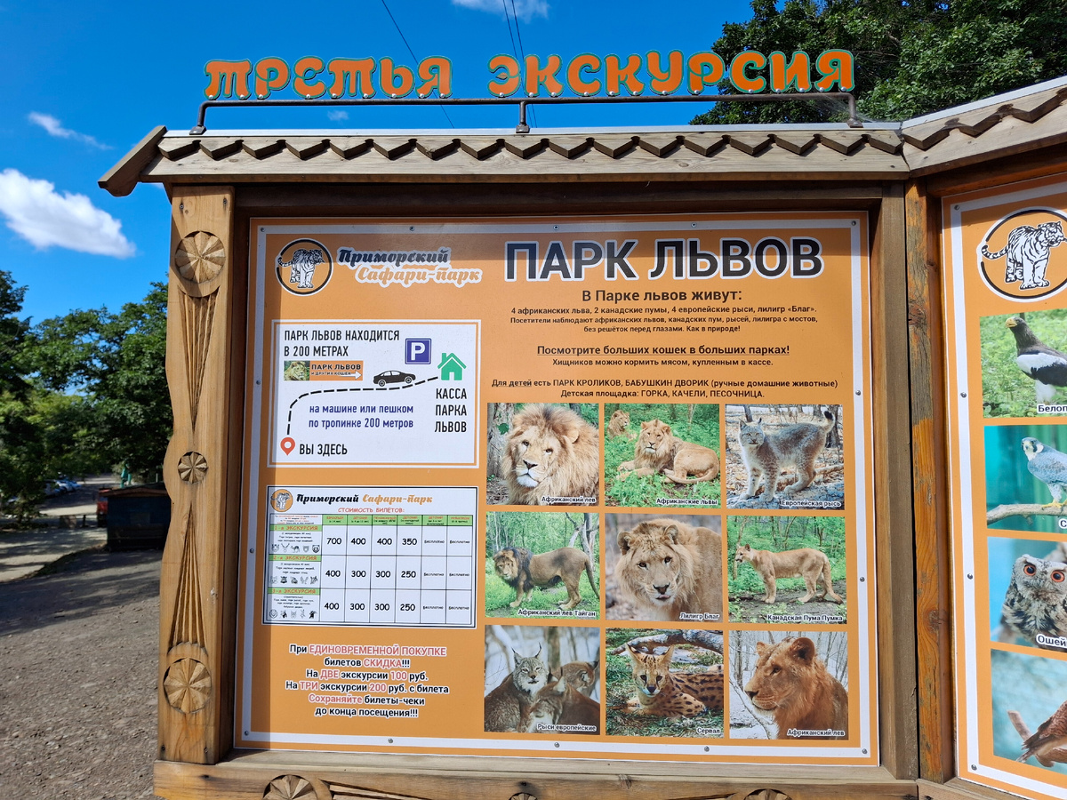 На первой и второй экскурсиях мы были, теперь идем на третью. Третья экскурсия без проводника. Самостоятельно. План территории Сафари-парка. Парк львов чуть подальше, чем остальные. По пути сувенирный киоск. Магниты на любой вкус. Продолжение правее. Конечно, с проводником удобнее. Сами мы прошли, видели рысь. И не одну. Видели львов. Жарко. Звери спят. Пора вставать! :) Сервал. Звери, которые есть в этом парке. Лилигр. Родители тигрица и лев. Но узнать его среди группы львов мы не смогли. Скамеечки в парке. Рыси. В конце экскурсии ко мне пристал какой-то птиц :))) Едем дальше.