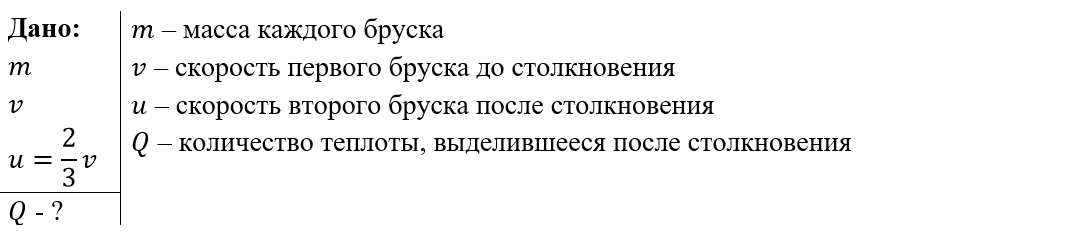 Полное условие задачи: Брусок массой 900 г, движущийся по гладкой горизонтальной поверхности со скоростью ʋ = 10 м/с, ударяется о такой же, но неподвижный брусок и теряет 2/3 своей скорости. Найдите количество теплоты, выделившейся при соударении брусков. Движение брусков считать поступательным. Краткое условие задачи: Решение задачи: Согласно закону сохранения импульса откуда скорость второго бруска после соударения Согласно закону сохранения энергии откуда количество теплоты, выделившееся при ударе, равно Ответ: 20 Дж.
