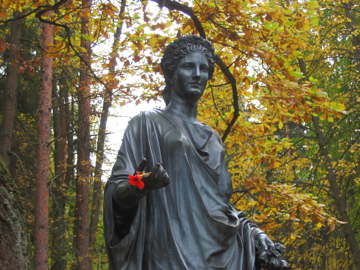 От просторов Парадного поля мы уходим под сень деревьев Старой Сильвии. Этот участок распланировал в 1739 году архитектор Винченцо Бренна. Первоначально здесь хотели устроить огромные солнечные часы, но помешал климат, поэтому Бренна нашел другое решение. В центре Старой Сильвии расположена большая круглая площадка, обсаженная дубами, от которой отходят двенадцать аллей. В центре площадки стоит бронзовая статуя Аполлона Бельведерского, а вокруг площадки расположились девять муз, богини Флора и Венера, бог Гермес. Статуи отлиты в Петербургской академии художеств по моделям с античных оригиналов. На конце четырех дорожек стоят Ниобиды. Ниоба - мать 14 детей осмеяла Латону - возлюбленную Зевса, у которой было лишь двое детей - Аполлон и Артемида. Желая отомстить за свою мать, разгневанные дети направили смертоносные стрелы в детей Ниобы. Они умирают один за другим на глазах у матери. Одна из них как будто бежит, спасаясь от гибели. Девять прекрасных муз окружают Аполлона: на флейте играе