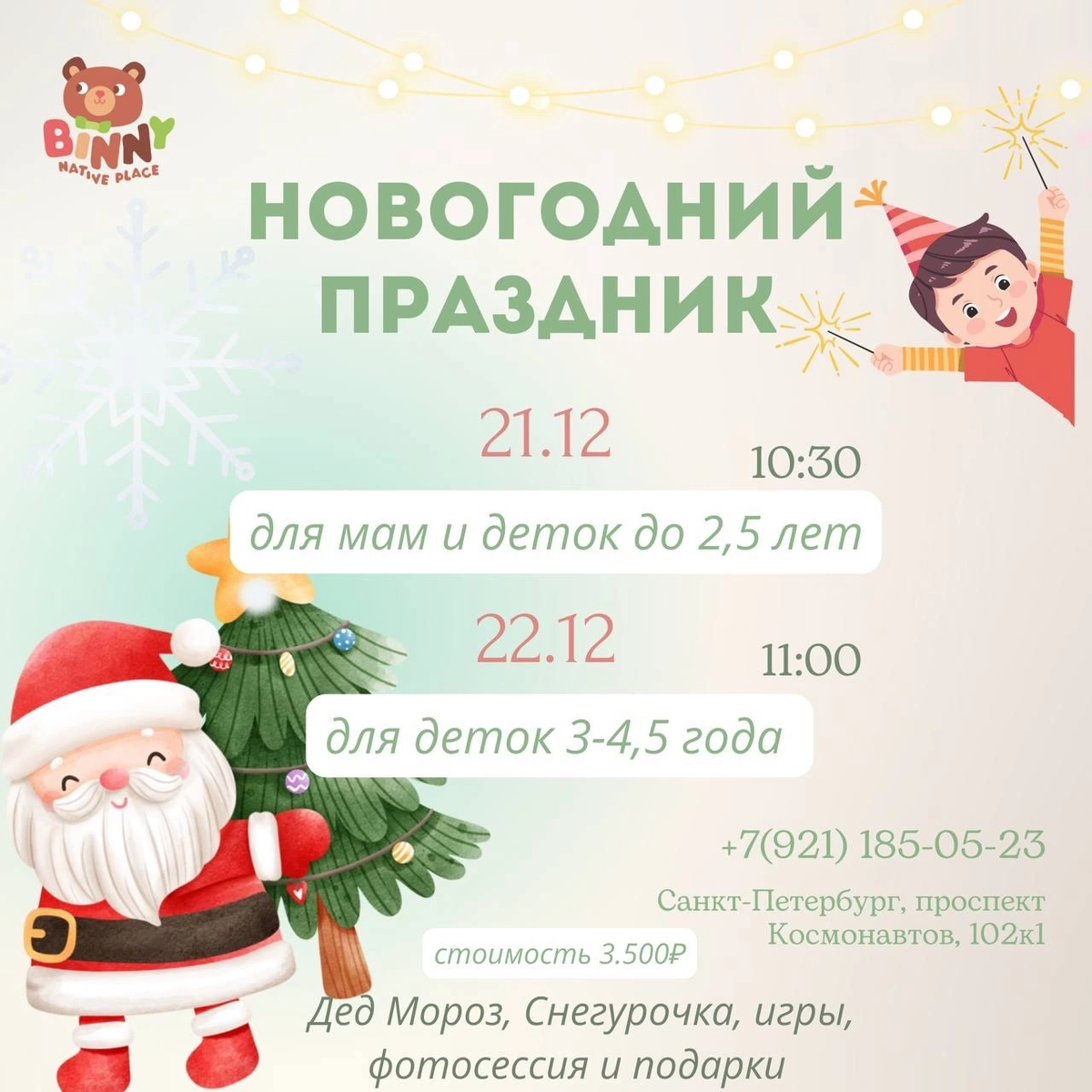 НОВОГОДНЯЯ СКАЗКА В BINNY ✨ Приглашаем на новогодний праздник! 🎄 В программе: 🎅 Визит Деда Мороза и Снегурочка 🥳 Интерактивные игры 📸 Фотосессия с волшебными моментами 🎁 Подарки для наших маленьких участников Не упустите возможность создать незабываемые воспоминания вместе с нами! Детки до 2,5 лет: 21 декабря в 10:30 Детки 3-4,5 года: 22 декабря в 11:00 Стоимость: 3500₽ Количество мест ограничено, для записи Вы можете обратиться по телефону, +7 (921) 185-05-23 🤍 Санкт-Петербург, проспект Космонавтов, 102к1