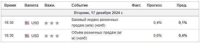 Сегодня в календаре также есть две новости, на которые можно обратить внимание. 16:30 USD Базовый индекс розничных продаж (м/м) (нояб). Предыдущее значение 0.1%, прогноз 0.4%.