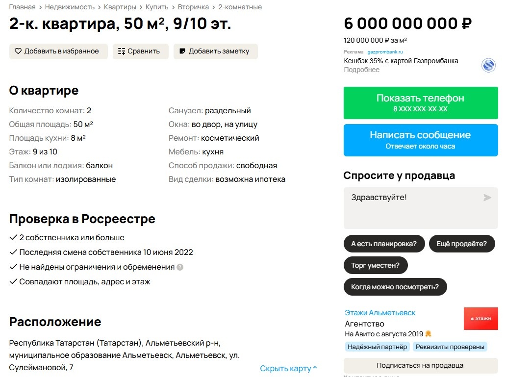 Лидером нашего необычного рейтинга становится 2-комнатная квартира в Альметьевске, Республика Татарстан. Цена – интеллектуале 6 000 000 000 рублей за 50 квадратных метров! Находится жилье на 9 этаже панельного дома 1989 года постройки. В квартире косметический ремонт, кухня площадью 8 м² и изолированные комнаты. Из окон открывается вид как во двор, так и на улицу. Продавец уверяет, что жилье идеально подходит для семьи: рядом есть школы, детские сады и поликлиники. Однако сложно не задаваться вопросами: чем вызвана такая цена? Отделка золотом? В комплекте идет персональная нефтяная скважина? Даже в элитных районах Москвы за такие деньги продаются дворцы. Вишенкой на торте стало примечание о возможности покупки в ипотеку. Похоже, владелец несколько перестарался с нулями при заполнении объявления, правда фото забыл прикрепить. 2. Необычная «двушка» в Дагестане – реальная стоимость или шутка?