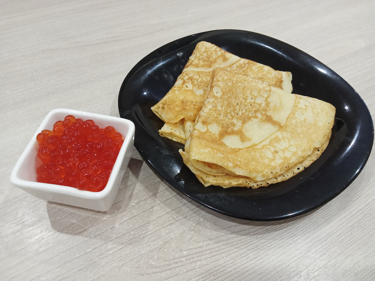 Рецептов приготовления блинов очень много. Делюсь одним из них. Он очень простой, но удачный. Ведь блины будут вкусные, мягкие и нежные. Берём чайную ложку меланжа (это соответствует половине куриного яйца), разбавляем его водой (примерно 20 гр.). Размешиваем и даём немного постоять, что бы смесь набухла. Почему меланж а не яйца? Объясняю: в моём случае надо было приготовить совсем небольшое количество блинов. По моим расчётам мне бы понадобилось половинка яйца. А разделить его на пополам ... лишняя морока. С меланжем проще. В ёмкость наливаем 125 мл. кефира, жирность 2,5 %, добавляем туда же соды (четверть чайной ложки), сахара (чайную ложку), соли (четверть чайной ложки), растительного масла (столовую ложку), муки (80 гр.). Всё это тщательно перемешиваю венчиком до однородности. Кстати, делается это легко. Даже миксер не понадобится. В эту массу заливаем 65 - 70 мл. кипятка и снова быстро перемешиваем. Смазываем разогретую сковородку растительным маслом, и начинаем выпекать блины.