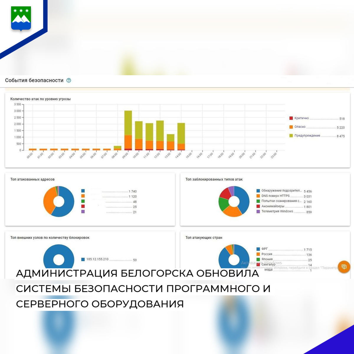 Администрация Белогорска обновила системы безопасности программного и серверного оборудования. Система обнаружения вторжений является современным инструментом для защиты информационных ресурсов от внешних и внутренних киберугроз. -Уже в первые сутки работы обновленной системы были выявлены несколько серьезных сетевых атак, - рассказали начальник управления цифровизации Леонид Страхолист. - Новая система показывает высокую эффективность в распознавании угроз. Это позволяет незамедлительно реагировать на каждый инцидент, подтверждая необходимость внедрения таких решений для защиты информации от внешних угроз. По данным мониторинга, значительное количество киберугроз поступает из ФРГ (1 715 атак), России (136 атак), Японии (25 атак), Сингапура (14 атак), Канады (1 атака) - Управление цифровизации продолжит внедрять новые технологии для обеспечения безопасности цифровых ресурсов администрации города Белогорск и ее структурных подразделений, а также своевременно реагировать на различные уро