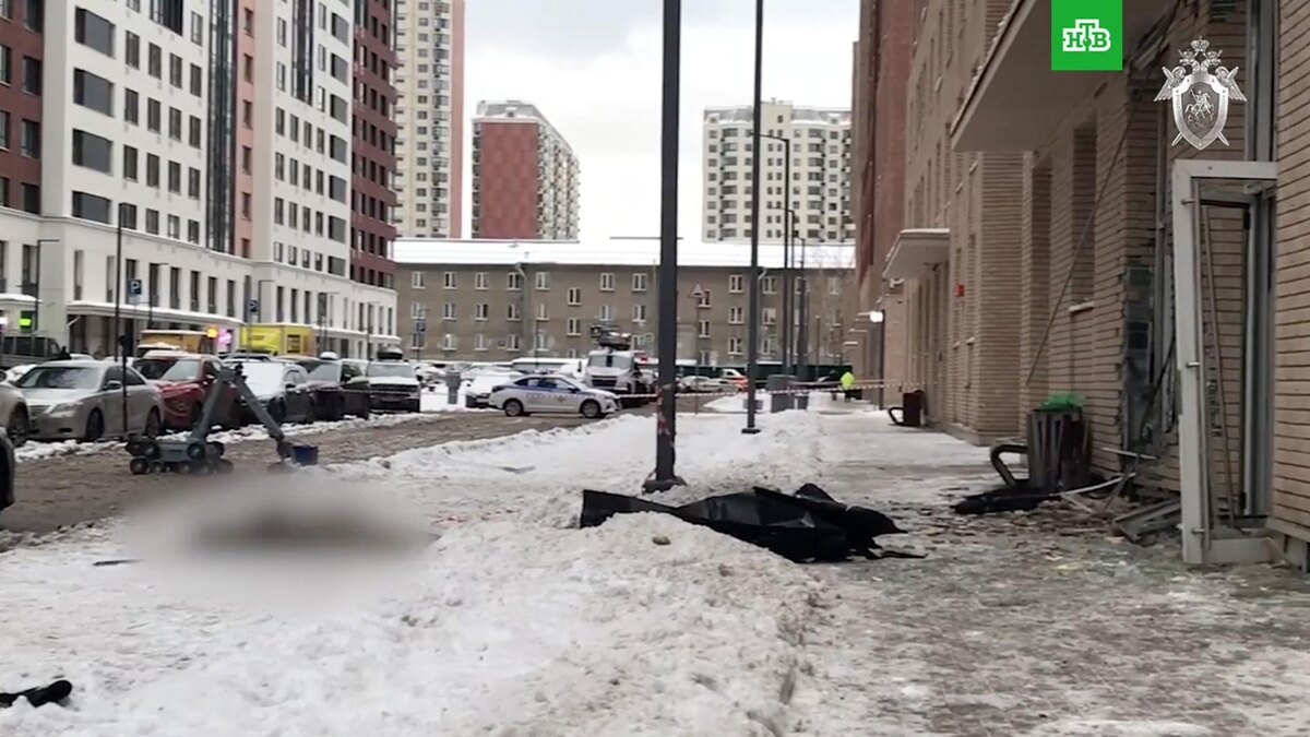 На кадрах видно, что вход в подъезд сильно повержден, а территория вокруг дома оцеплена.