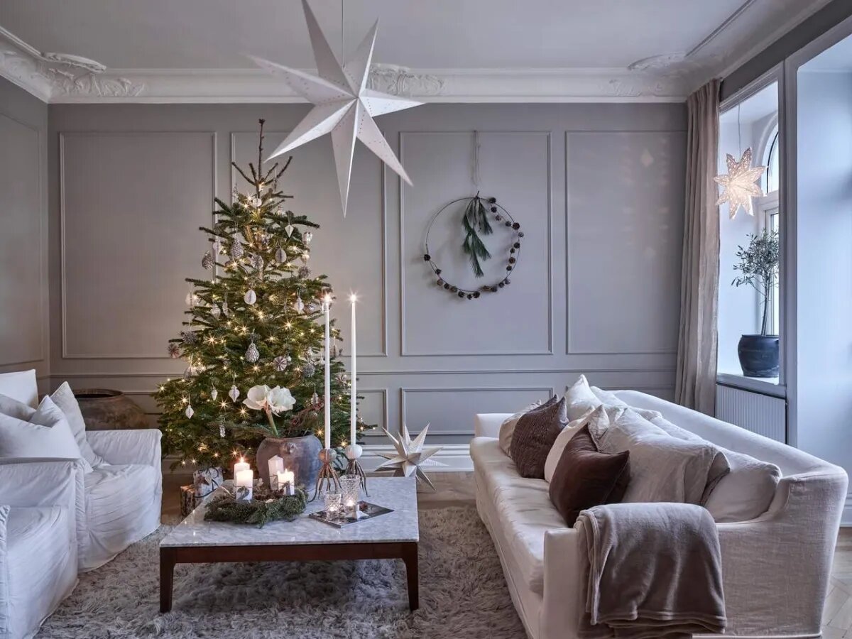 Вместо перегруженного декора скандинавы выбирают несколько ключевых акцентов. Например, одна гирлянда из теплых огоньков, пара свечей и небольшие композиции из шишек и зелени способны создать атмосферу праздника. 3. Природные мотивы